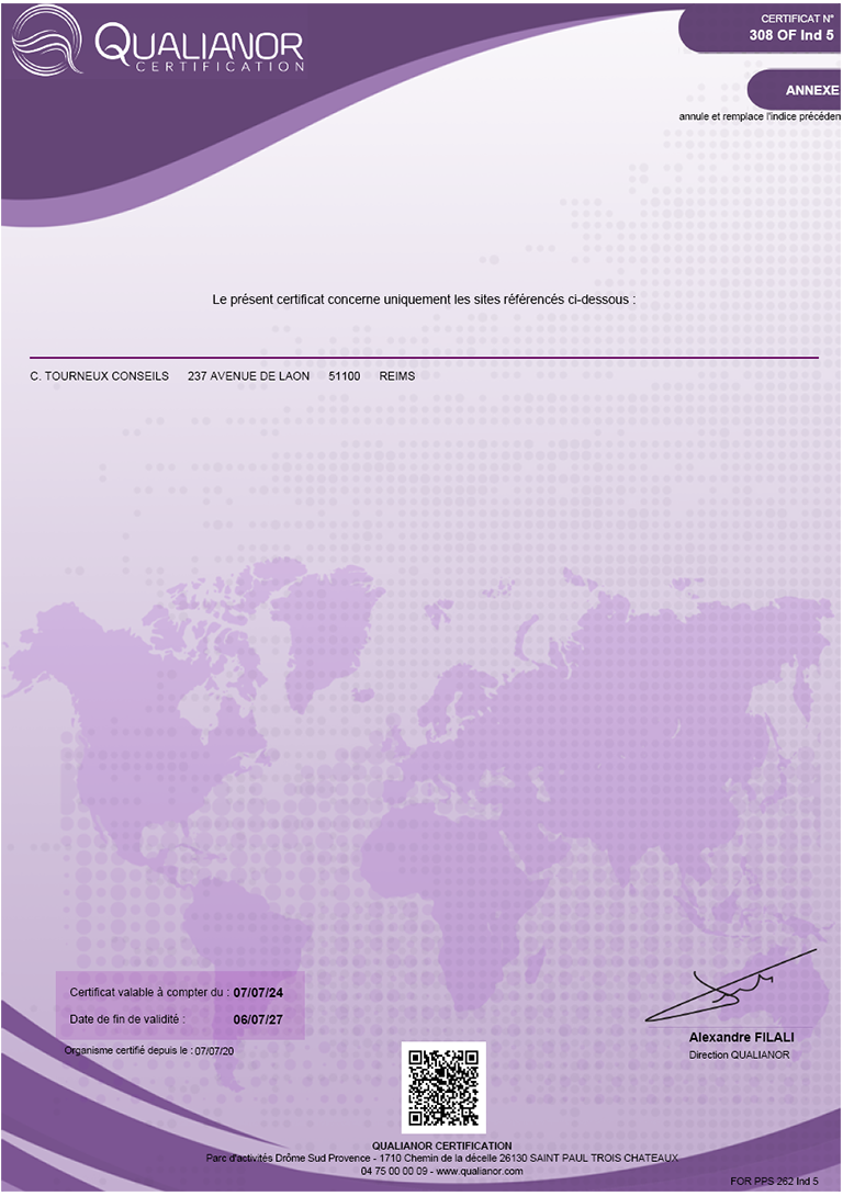 Depuis le 7 juillet 2020, OCR STRATEGIE est certifiée QUALIOPI (certificat QUALIANOR 308 OF). La certification qualité a été délivrée au titre de la catégorie suivant : Actions de Formation.